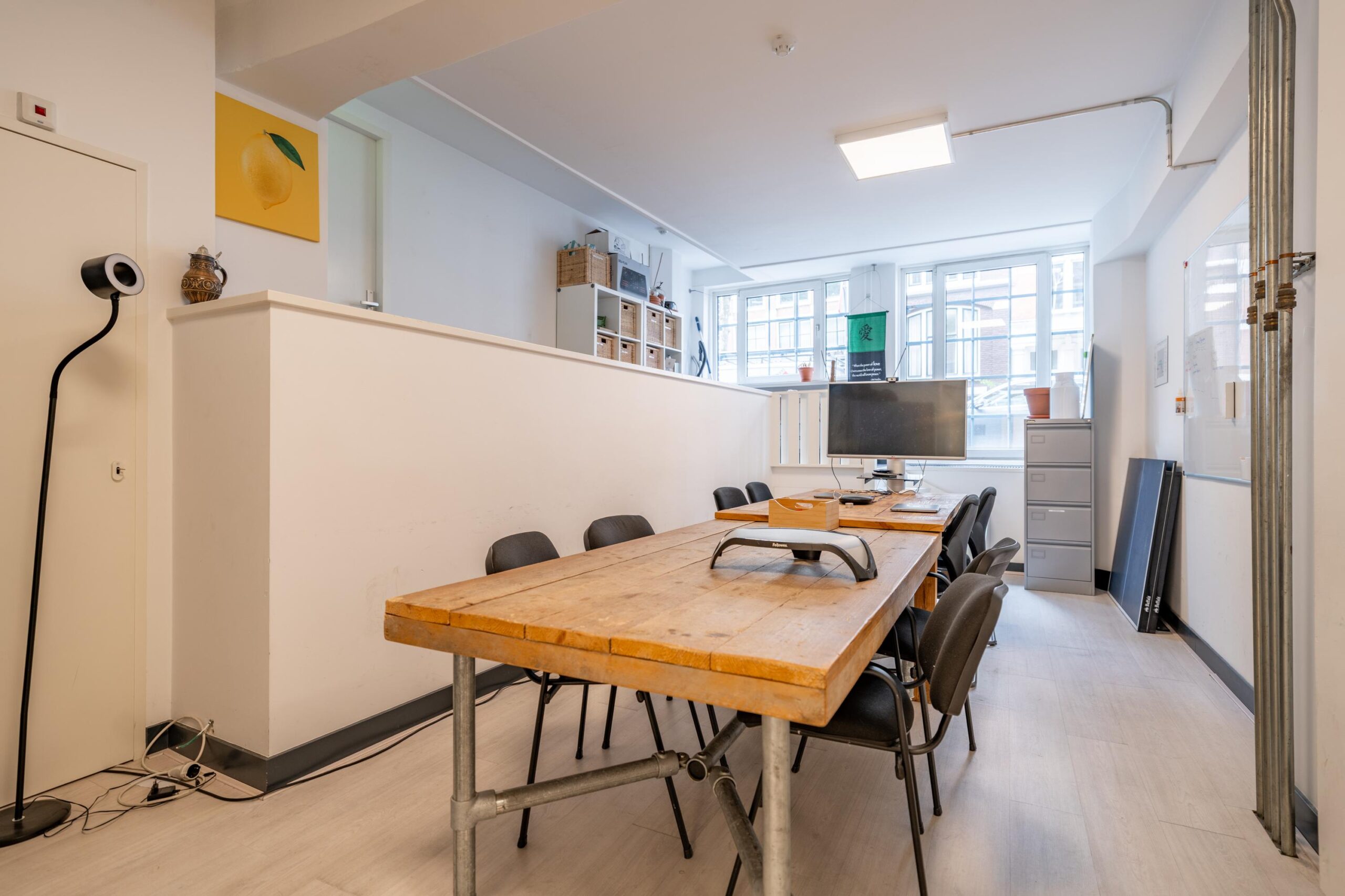 Binnenkomst in gemeenschappelijke travertin, de kantoorruimte beschikt over een eigen entree. De ruimte beschikt over veel daglicht toetreding met ramen aan twee zijden.